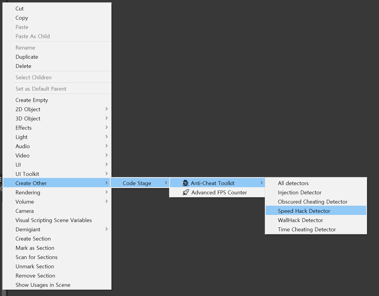 먼저 Hierarchy 메뉴에서 스피드핵 디텍터 오브젝트를 만들자.